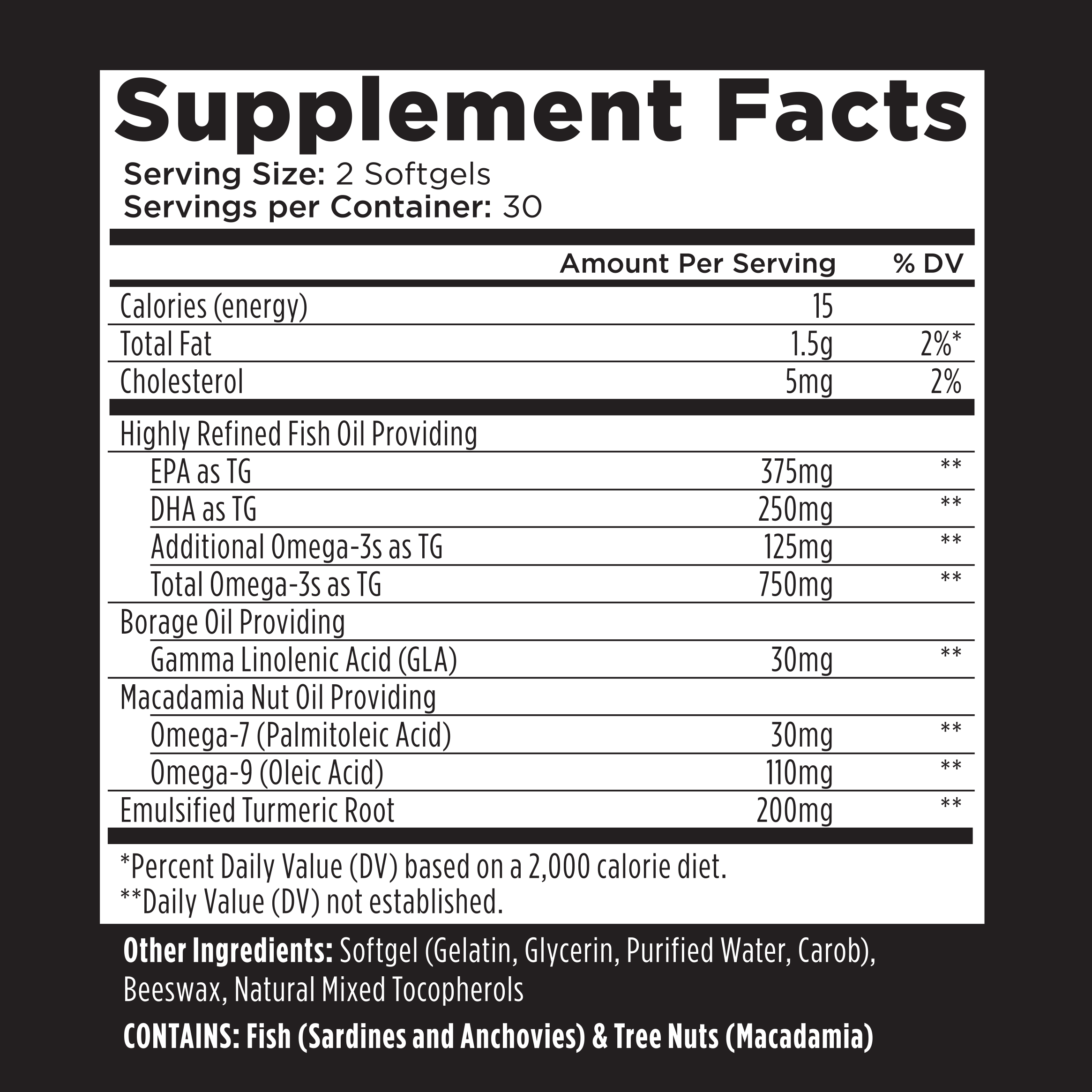 It is complete with omegas 3, 6, 7, and 9. All of which are extracted from extremely high-quality sources including superior TG fish oil, borage oil, and macadamia nut oil.